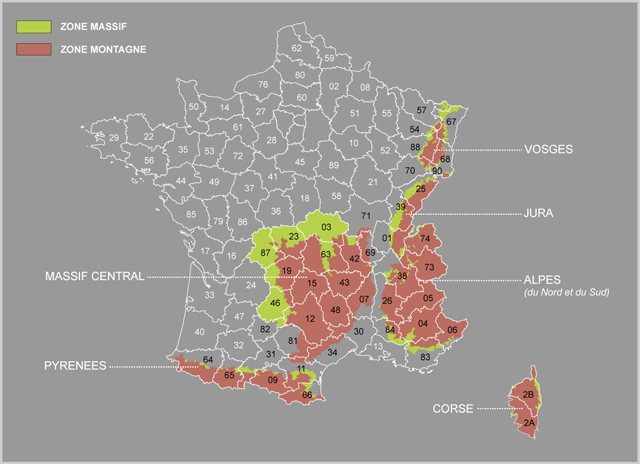 Nous rajoutons à cette nomenclature les zones de montagne, en France et à La Réunion, déterminées par la Loi Montagne.