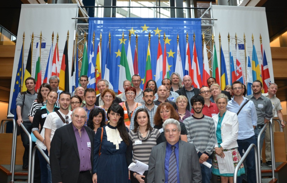 Une partie des participants au Carrefour Européen des Radios Libres devant le Parlement Européen à Strasbourg